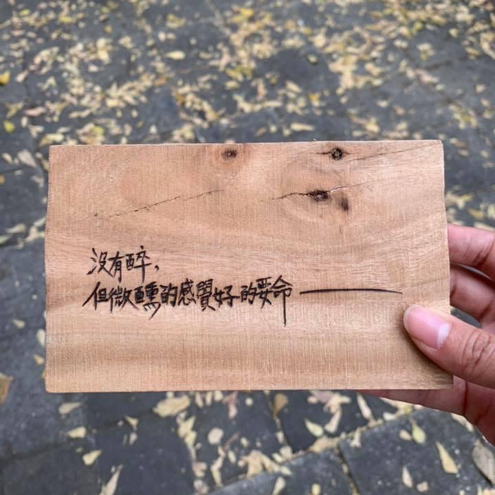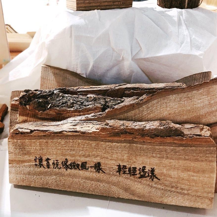 與手寫字藝術師合作,藝術家手感文字,搭配手工燒刻在不規則樟木上。